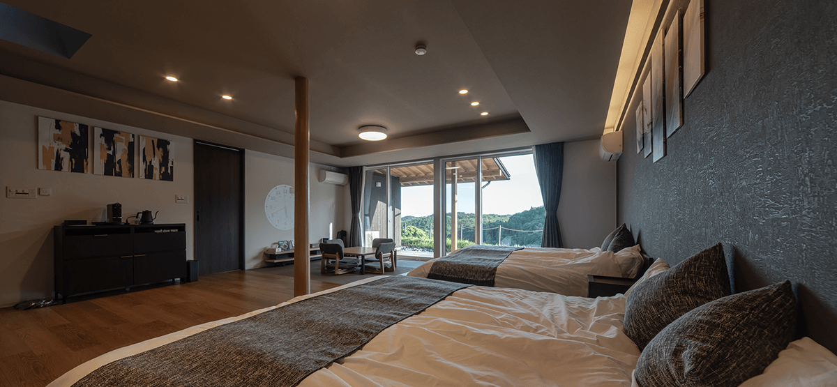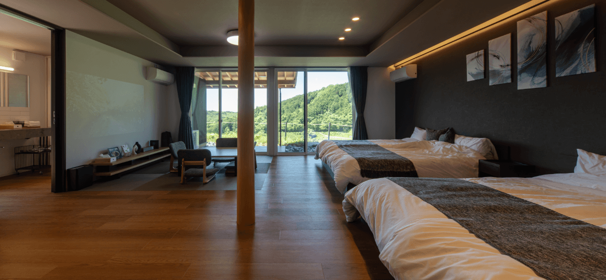 一棟貸しのVILLAは完全なプライベート空間。客室露天風呂から星空と棚田を独り占め出来ます。オールインクルーシブのドリンクやエアウィーヴのワイドキングベッド、大型プロジェクターなど日常を忘れて過ごすことが出来ます。
