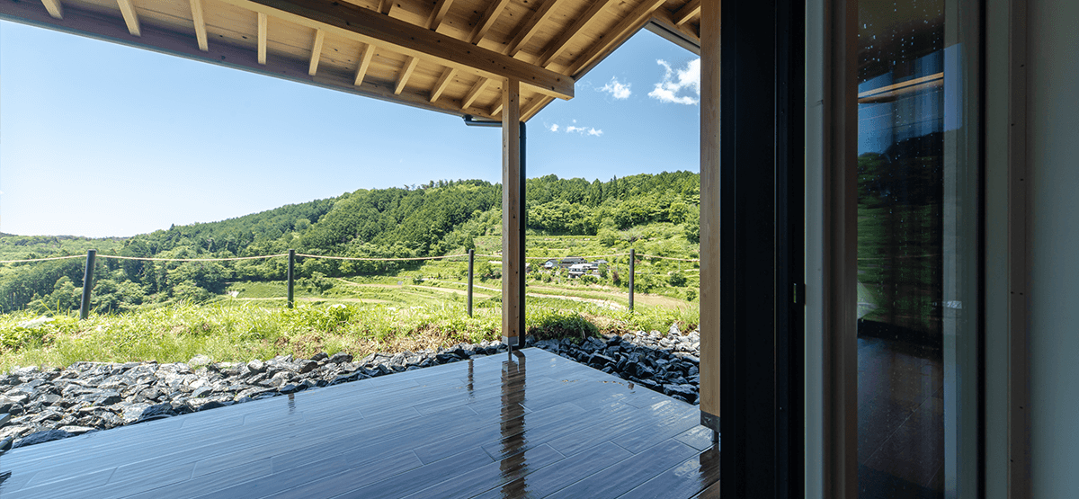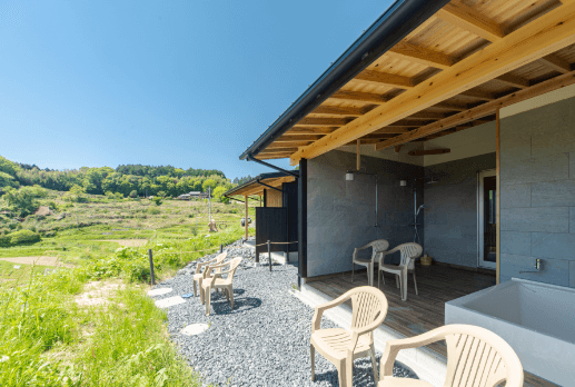 - 浴室は屋内にシャワーブース、屋外に露天風呂(棚田ビュー)