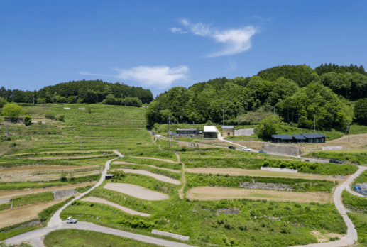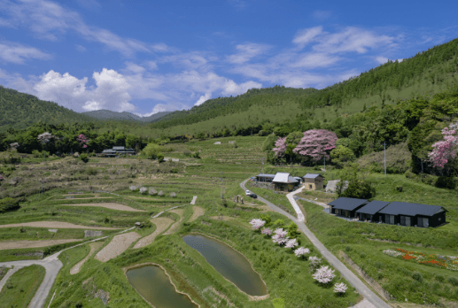 サウナから一望できる上籾棚田は四季折々にその表情を変化させ、山々と調和して美しい風景となっています。
