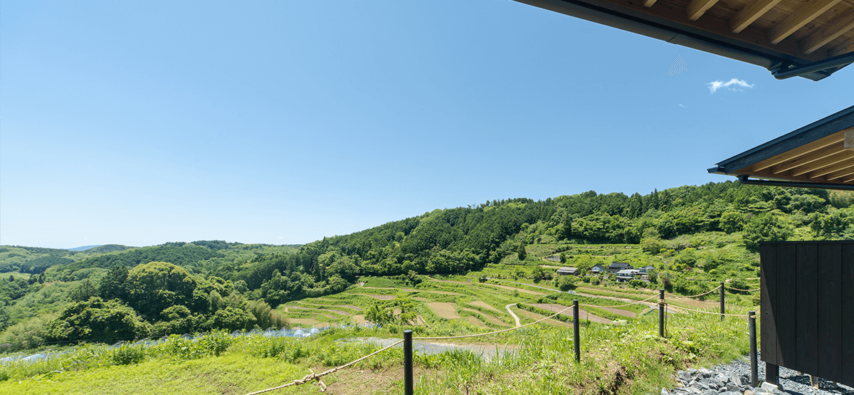 サウナから一望できる上籾棚田は四季折々にその表情を変化させ、山々と調和して美しい風景となっています。