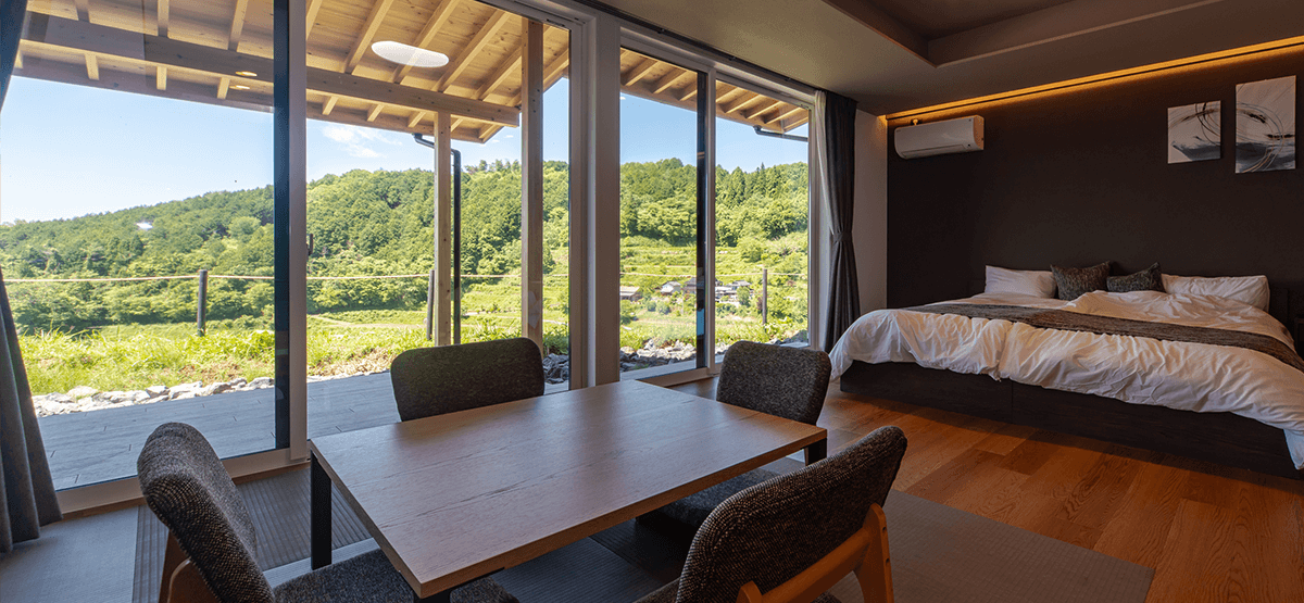 一棟貸しのVILLAは完全なプライベート空間。客室露天風呂から星空と棚田を独り占め出来ます。オールインクルーシブのドリンクやエアウィーヴのワイドキングベッド、大型プロジェクターなど日常を忘れて過ごすことが出来ます。