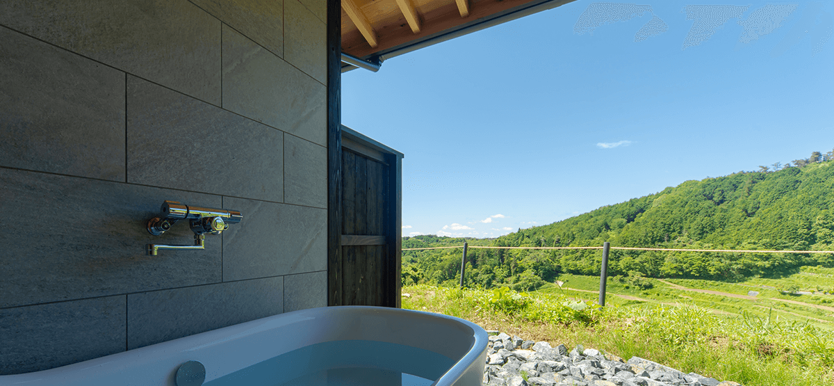 - 浴室は屋内にシャワーブース、屋外に露天風呂(棚田ビュー)