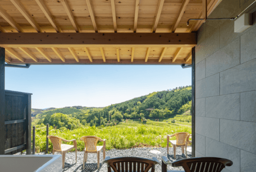 セルフロリュウのサウナはヒノキや柚子、ヨモギなど地元産の和ハーブの香りに包まれます。サウナ後は絶景の棚田を眺めながらの水風呂やミストシャワーで瞬く間に副交感神経が優位になり、極上のととのいを感じることができます。